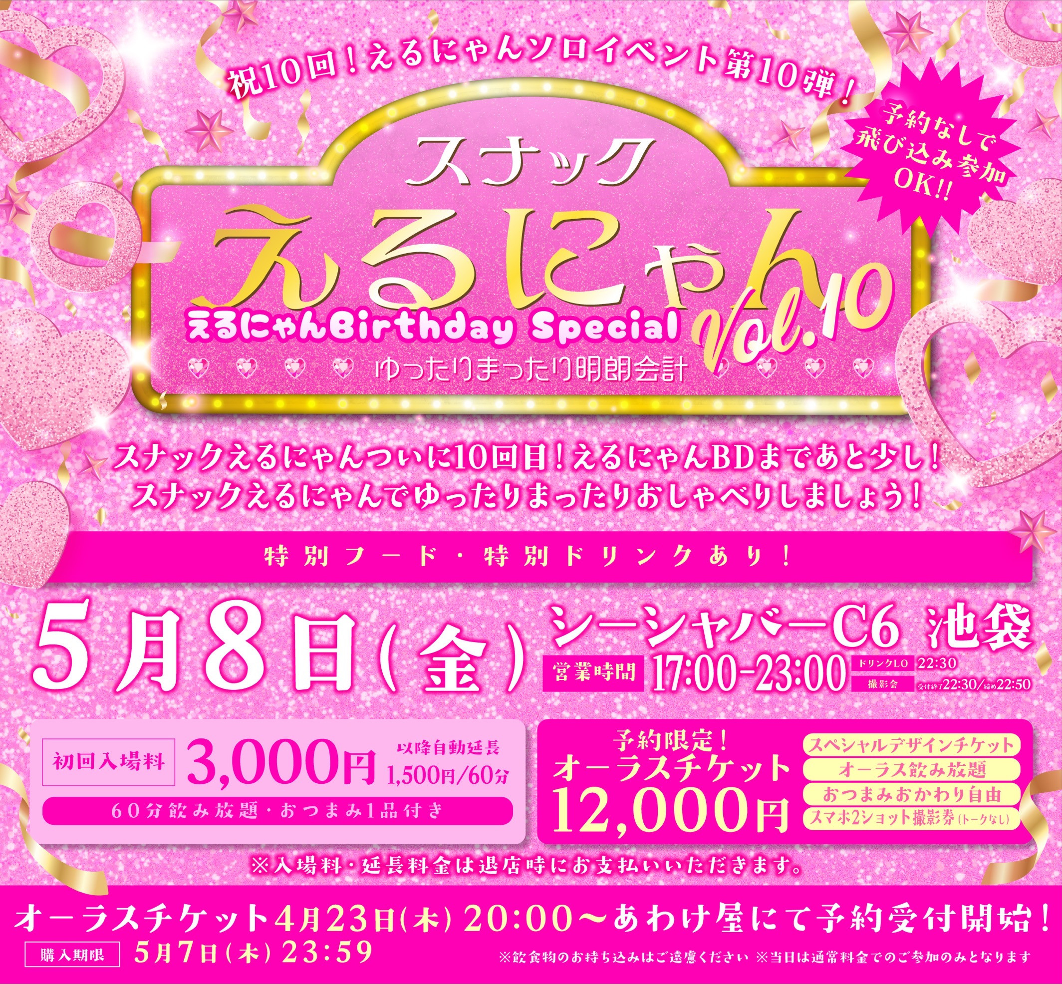 5月8日(金) 池袋シーシャバーC6 えるにゃんソロイベント第10弾! 「スナックえるにゃんVol.10」 〜ゆったりまったり明朗会計〜 祝10回🎊えるにゃんBD Special✨開催決定!!