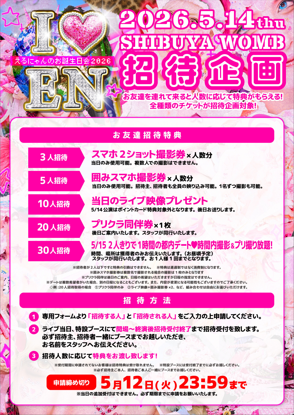 ※組み合わせは人数に応じて自由にお選びいただけます(例:20名招待→①プリクラ同伴のみ ②ライブ映像+囲み撮影券×5など)